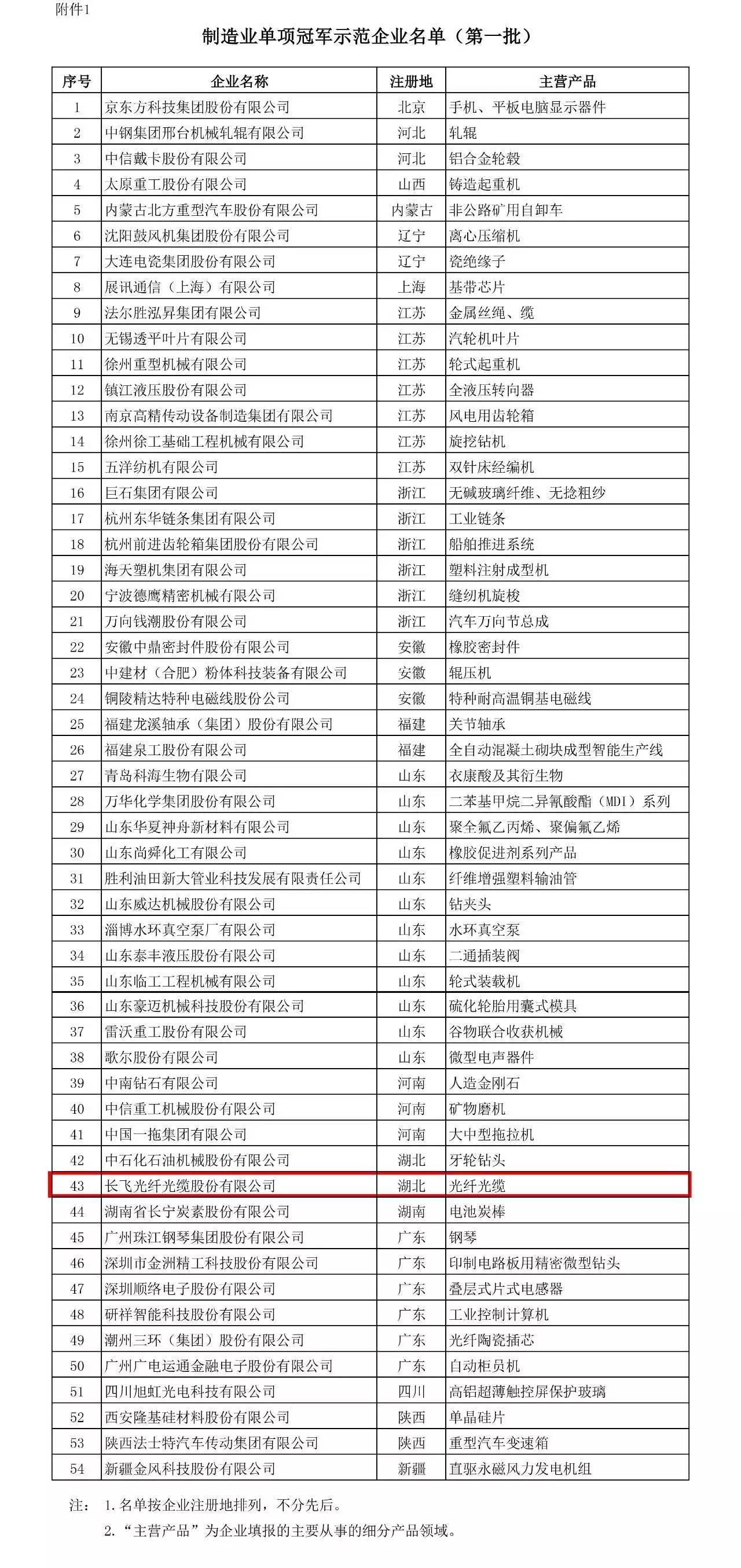 為貫徹落實《中國制造2025》,引導制造業(yè)企業(yè)專注于細分產品領域精耕細作,根據《制造業(yè)單項冠軍企業(yè)培育提升專項行動實施方案》(工信部產業(yè)〔2016〕105號),經企業(yè)自主申報、地方工業(yè)和信息化主管部門及有關行業(yè)協會推薦、專家論證和網上公示等程序,昨日,確定并公布了第一批制造業(yè)單項冠軍示范企業(yè)和培育企業(yè)名單,長飛光纖光纜股份有限公司(股票代號:06869.HK,以下簡稱“長飛公司”)榜上有名,榮膺制造業(yè)單項冠軍示范企業(yè)。(榜單詳見附表)同時,長飛公司再次成為國內光纖光纜行業(yè)中唯一一家獲此殊榮的企業(yè)。