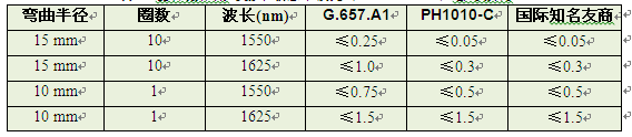 器件拉錐用彎曲不敏感單模光纖(PH1010-C)光學指標完全滿足G.652.D標準,宏彎損耗比ITU-T發布得G.657.A1標準更優,如下表: