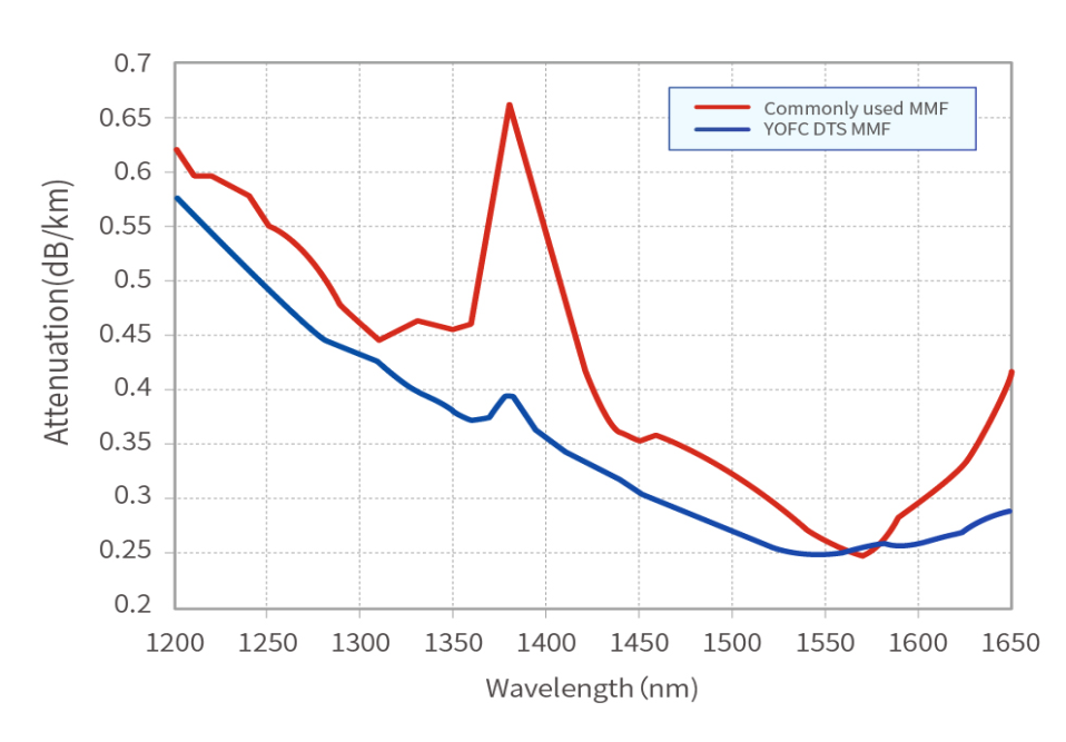 由于多模光纖的拉曼增益高、受激閾值高,因此成熟的分布式測溫產品多采用多模光纖作為傳感光纖。但傳統的通信多模光纖僅優化了波長850nm和1300nm處的衰減,較高的C波段衰減嚴重影響了長距離測量的信噪比,另一方面較大的模間色散會造成長距離測試下空間分辨率的劣化。此外,普通多模光纖因其幾何一致性較差,會導致接續點測得的溫度出現跳變。