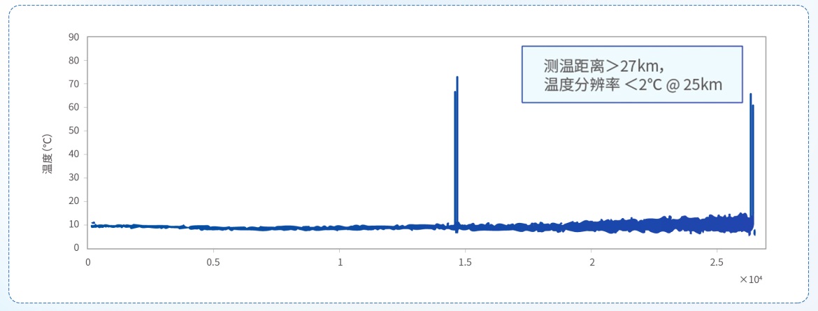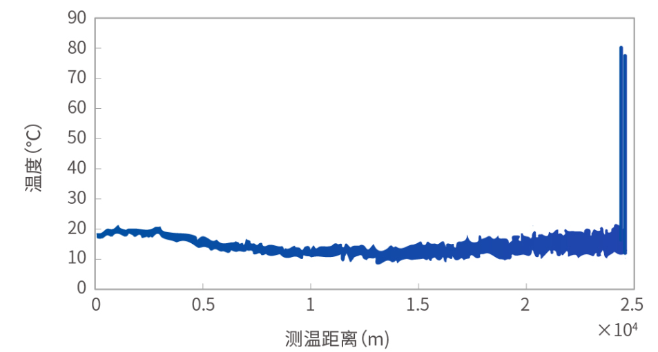 性能優化后的測溫多模光纖結合長飛DTS主機測試結果顯示,溫度曲線平整,測溫距離在25km時,溫度分辨率優于2℃,空間分辨率約2-3米。另外,此光纖還做了抗彎和耐高溫涂層處理,使該光纖更適合成纜以及高溫應用。