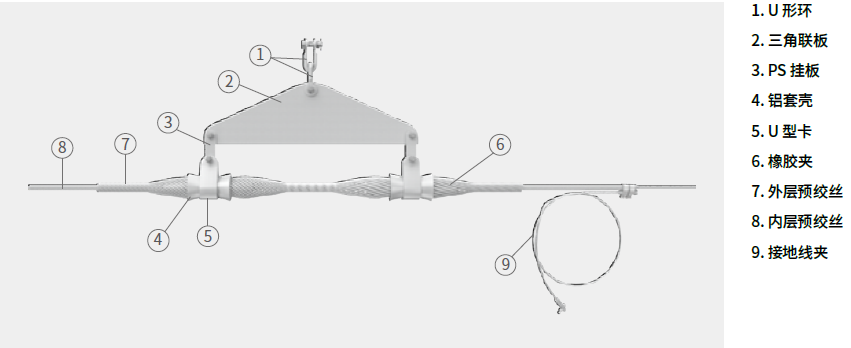 雙懸垂線夾采用雙懸掛頭設計方案,包括內外層預絞絲、兩套懸掛頭、接地線夾和配套連接件等。雙懸垂線
