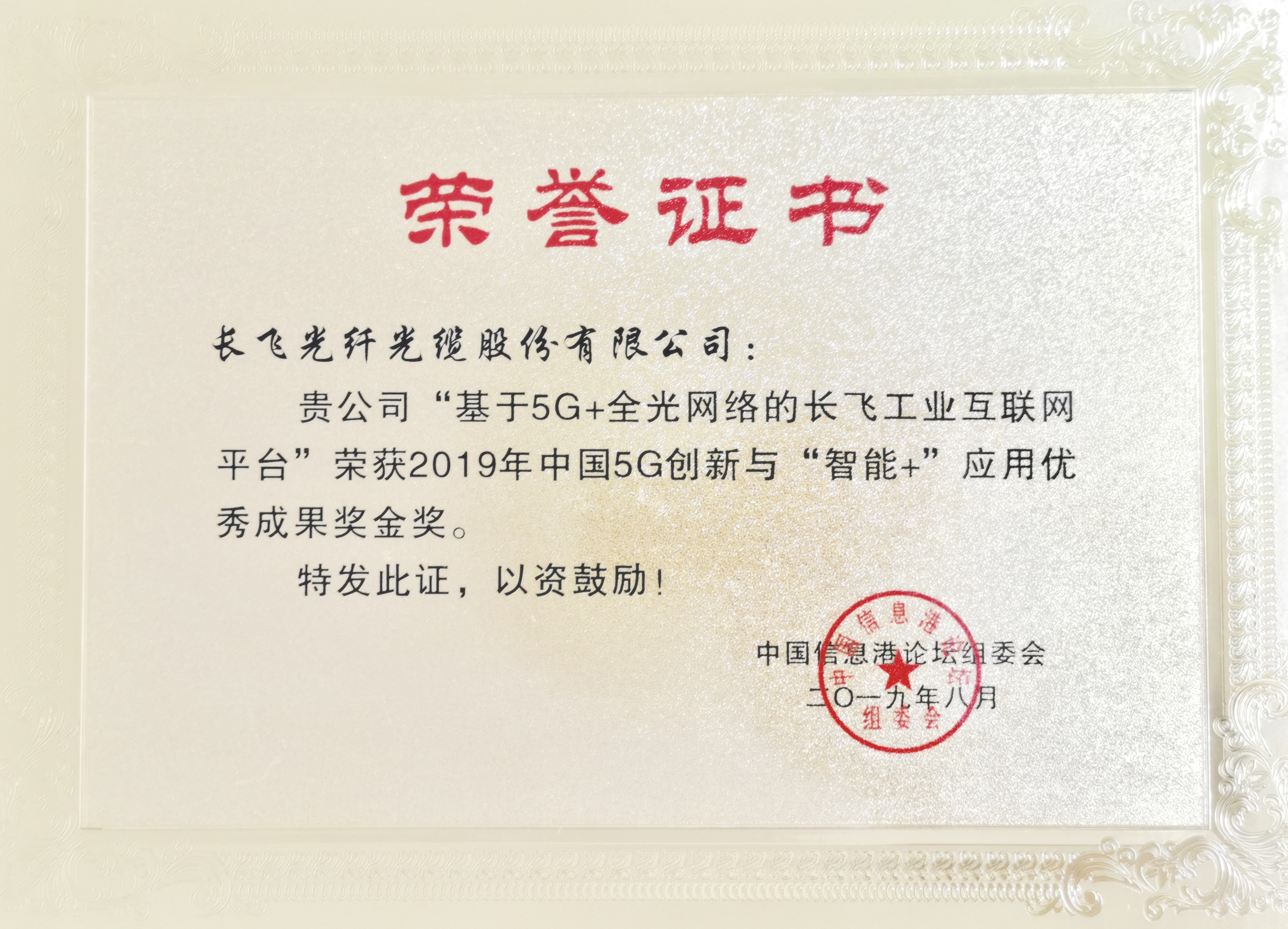 長飛公司提交的“基于5G+全光網絡的長飛工業互聯網平臺”方案,在大會收到的近200個獎項評選中脫穎而出,榮獲2019年中國5G創新與“智能+”應用優秀成果獎金獎,充分肯定長飛公司在工業互聯網領域獨特的產品與技術優勢。