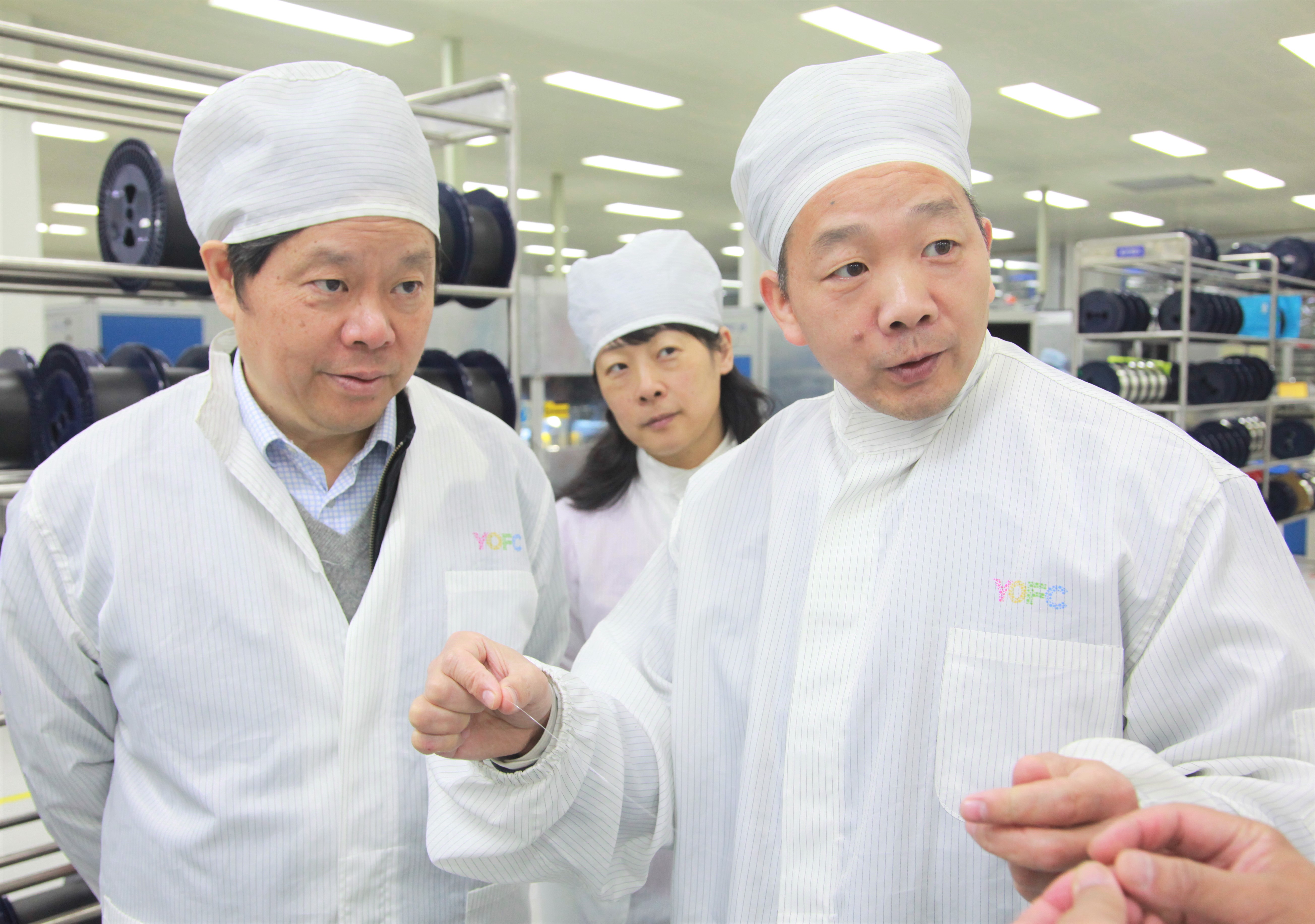 參觀車間時(shí),劉德富一行重點(diǎn)了解了光纖預(yù)制棒、光纖產(chǎn)品的主要生產(chǎn)工藝過程。劉德富高度評(píng)價(jià)長飛公司,對(duì)公司全系統(tǒng)完整的設(shè)備及技術(shù)的自主開發(fā)、解決能力和輸出能力表示肯定和贊賞。
