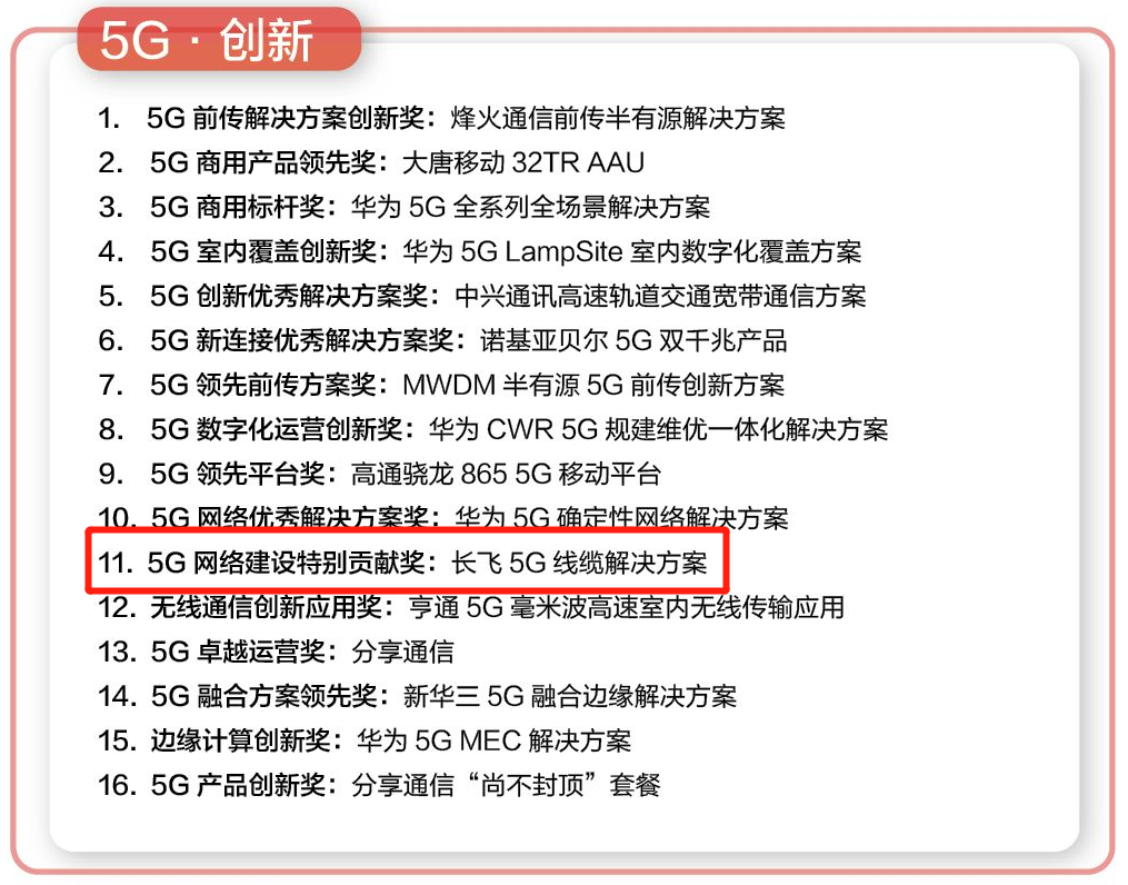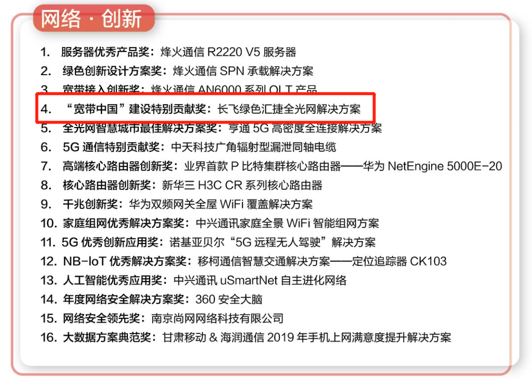 2019年是5G商用元年,全行業(yè)都在圍繞5G進(jìn)行產(chǎn)業(yè)創(chuàng)新。在此過(guò)程中,哪些新理念指引未來(lái)方向?哪些新技術(shù)引領(lǐng)行業(yè)發(fā)展?哪些產(chǎn)品具備跨時(shí)代意義?哪些方案?jìng)涫苁袌?chǎng)青睞?近日,《人民郵電》報(bào)聚集運(yùn)營(yíng)商、專家及資深編采隊(duì)伍的智力資源,面向行業(yè)推出2019年度《人民郵電》ICT創(chuàng)新獎(jiǎng)。長(zhǎng)飛光纖光纜股份有限公司(以下簡(jiǎn)稱“長(zhǎng)飛公司”,股票代碼:601869.SH、06869.HK)在5G創(chuàng)新方面榮獲“5G網(wǎng)絡(luò)建設(shè)特別貢獻(xiàn)獎(jiǎng)”,在網(wǎng)絡(luò)創(chuàng)新方面榮獲“‘寬帶中國(guó)’建設(shè)特別貢獻(xiàn)獎(jiǎng)”。