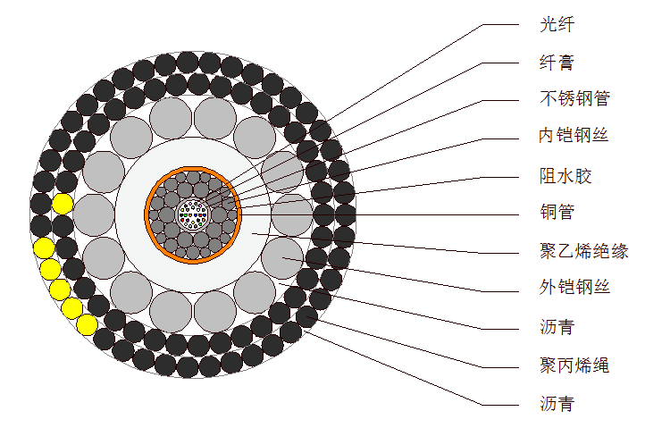 該光纜適用于在敷設、埋設、回收、運行時具有單層鎧裝防護的淺海中特定區域 |