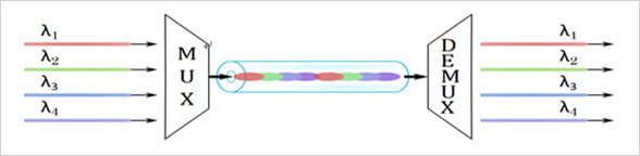 在傳輸速率提升的推動下,多模光纖的應用近幾年出現了三個重要變化:一是單波長已經達到25G、50G;二是并行技術(Parallel Optics Technology,采用MPO連接器)大量采用;三是短波波分復用(SWDM,Short Wavelength Division Multiplexing,見圖1)相關產業鏈逐步成熟。這些對多模光纖提出了新的要求,特別是多模光纖的幾何和帶寬性能,以及產品的一致性和均勻性。