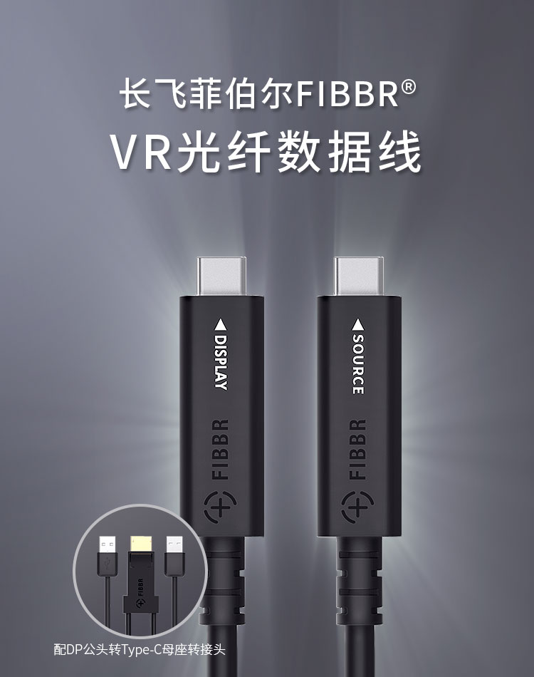 長飛菲伯爾FIBBR?VR光纖數據線,是長飛光纖光纜股份有限公司(以下簡稱“長飛公司”,股票代碼:601869.SH、06869.HK)旗下子公司長芯盛進軍VR領域的首款產品,該VR光纖數據線適配新一代HUAWEI VR Glass眼鏡,USB type-C主纜和DP公頭轉type-C母座轉接頭搭配使用,可同時支持手機和計算機直連,巨幕觀影高清過癮,游戲沖關一呼百應。