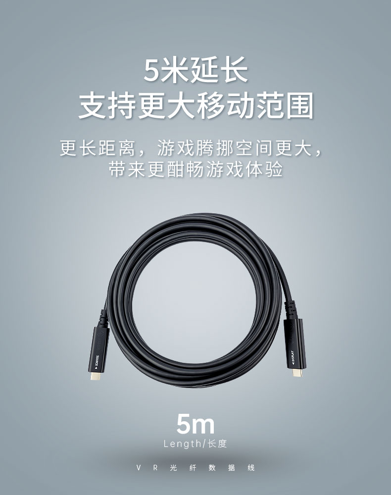 這款VR光纖數據線長達5米,采用長飛公司特種抗彎光纖,線材輕柔細軟,連接VR眼鏡后,使得人體動作不受束縛,可提供更大的移動空間,真正讓受眾享有自由輕松的沉浸式體驗。同時,線材的光纖材料不產生電磁干擾,其極低的信號衰減率,使觀影大片畫質清晰、流暢穩(wěn)定,使游戲視頻幾乎無卡頓,相較銅線傳輸信號更穩(wěn)定、更完整。
