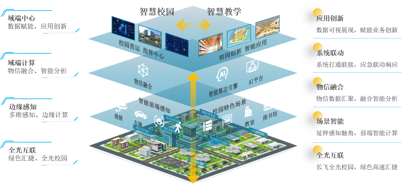 教育部2018年發(fā)布的《教育信息化2.0行動(dòng)計(jì)劃》一文中明確指出,現(xiàn)階段我國的教育信息化工作是以“三通兩平臺(tái)”為基礎(chǔ),到2022年基本實(shí)現(xiàn)“三全兩高一大”的發(fā)展目標(biāo)。長飛公司智慧教育解決方案可提升學(xué)校的智慧教學(xué)信息化水平,助力構(gòu)建“互聯(lián)網(wǎng)+”條件下的人才培養(yǎng)新模式:在接入層,聚焦以AI識(shí)別算法為基礎(chǔ)的安全校園和以窄帶物聯(lián)網(wǎng)為基礎(chǔ)的智慧環(huán)境,緩解學(xué)校管理層面臨的長期管理痛點(diǎn);在應(yīng)用層,聚焦基于大數(shù)據(jù)為核心技術(shù)的個(gè)性化學(xué)習(xí)和泛在自適應(yīng)學(xué)習(xí),助力每個(gè)學(xué)生精準(zhǔn)提分。