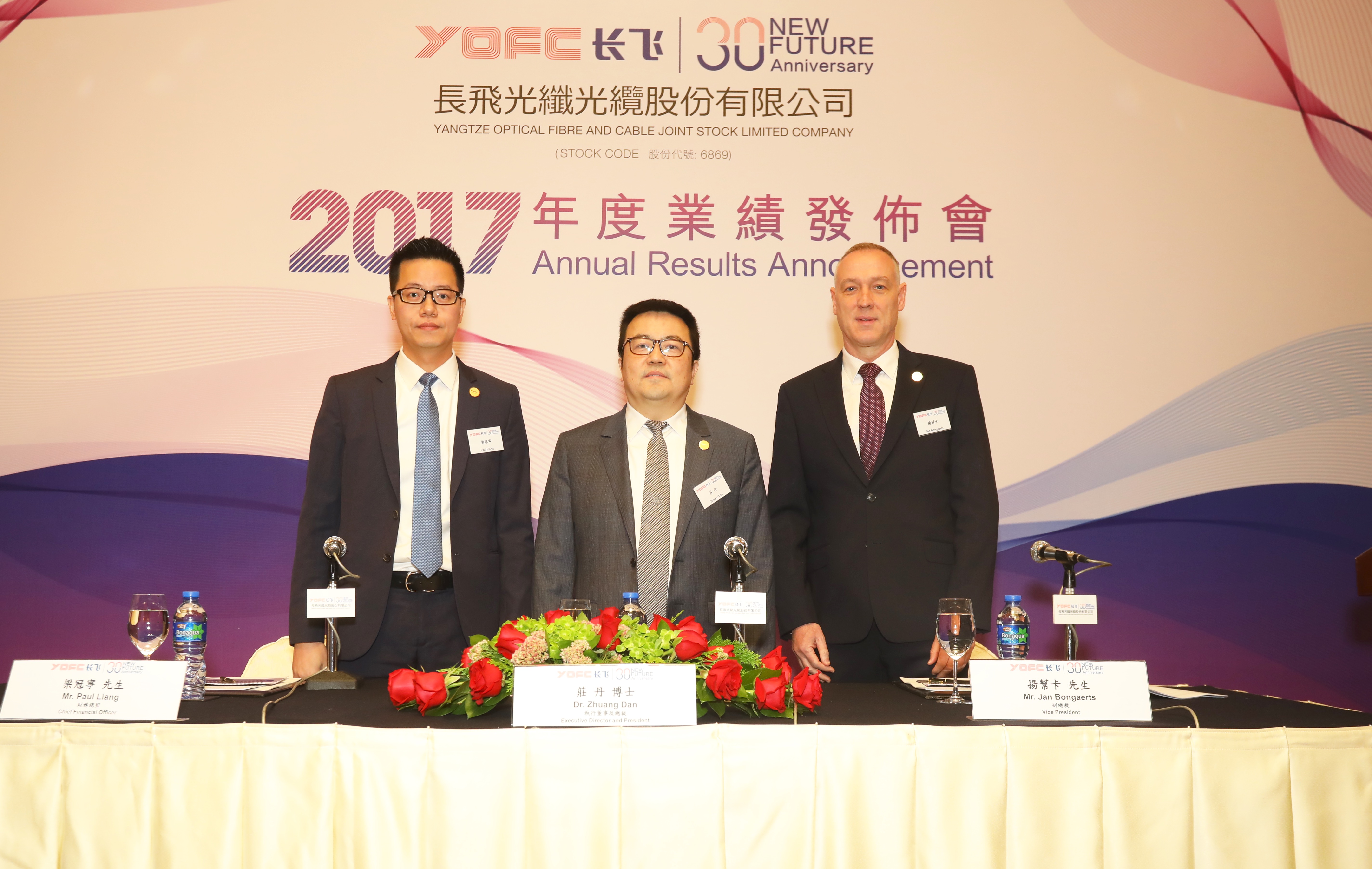 2018年3月13日,長飛光纖光纜股份有限公司(以下簡稱“長飛公司”,股票代碼:06869.HK)在香港召開業(yè)績發(fā)布會(huì),發(fā)布了長飛公司及其附屬公司截至2017年12月31日的年度合并業(yè)績。長飛公司執(zhí)行董事兼總裁莊丹、副總裁Jan Bongaerts及財(cái)務(wù)總監(jiān)梁冠寧出席了業(yè)績發(fā)布會(huì)。