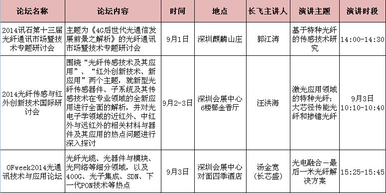 第16屆中國國際光電博覽會(CIOE2014)將于9月2~5日在深圳會展中心舉行,長飛光纖光纜股份有限公司將攜全系列光纖光纜產品及綜合解決方案參展,并在展會期間的論壇活動發表多個主題的演講(見下表)。長飛公司展位號為:1B09,歡迎您蒞臨參觀指導!
