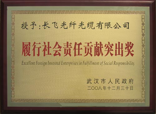 2009年2月12日,在武漢市對外開放工作大會上,武漢市人民政府授予長飛光纖光纜有限公司 “履行社會責任貢獻突出獎”,以充分肯定和表彰長飛公司作為“社會公民”,在誠實守信的經營過程中,在抗震救災、扶貧濟困、捐資助學等社會公益事業方面,慷慨相助,忠實履行社會責任,贏得了社會各界充分肯定和廣泛贊譽,成為履行企業社會責任的典范。